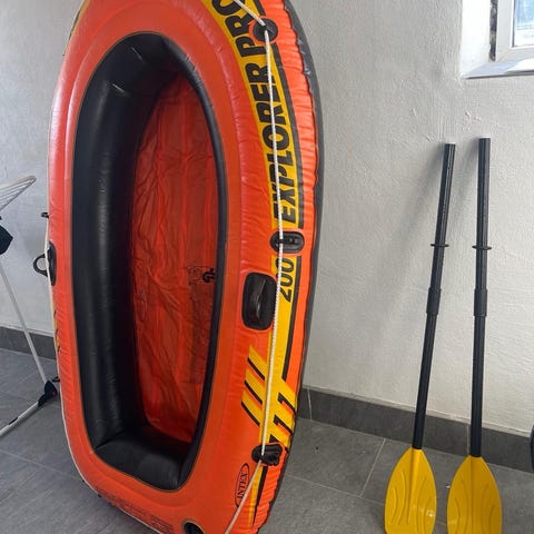 Intex oppustelig båd med årer i orange og sorte farver. Båden er fremstillet i plast og har ventil til oppustning. Medfølgende årer består af sorte skafter og gule plastblade, der kan samles til et sæt årer. Velegnet til brug i pool, sø eller roligt vand, hvor en mindre oppustelig båd er passende. Brugt 1 gang