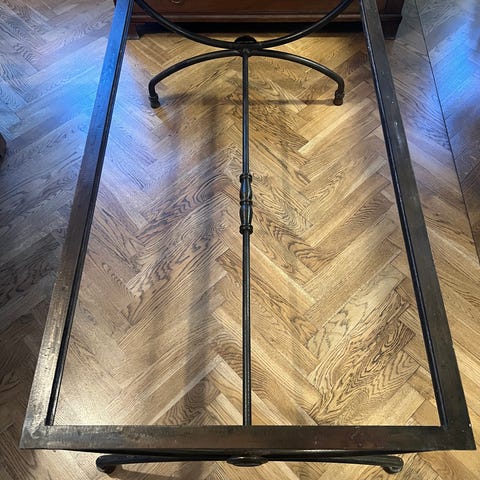 sofabord i glas og metal. Rektangulær bordplade i klart glas med metalramme og ben.