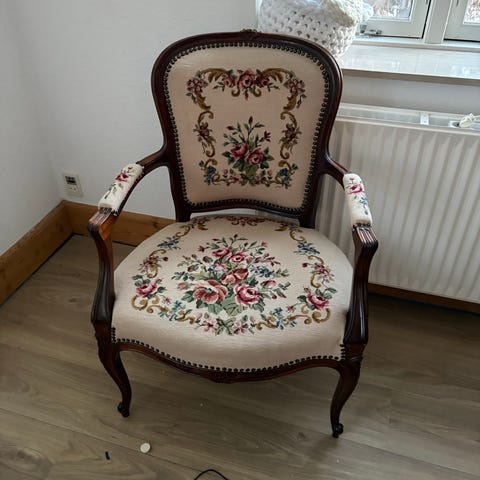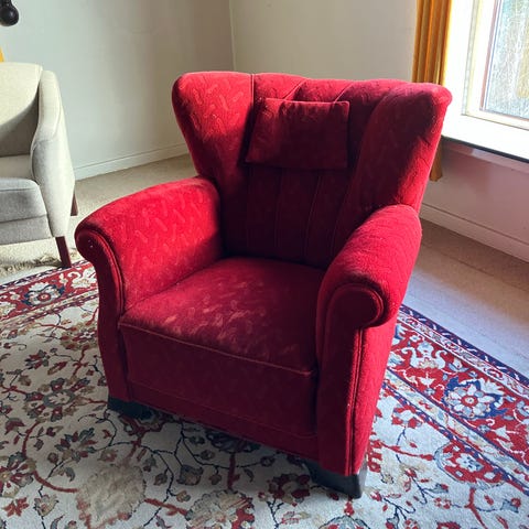 Super lækker retro læne stol i rød farve. Kunne blive shinet helt op med fedt med farve i. Man sidder dejligt blødt. Der er hjul bagpå så man nemt kan flytte den når der skal gøres rent