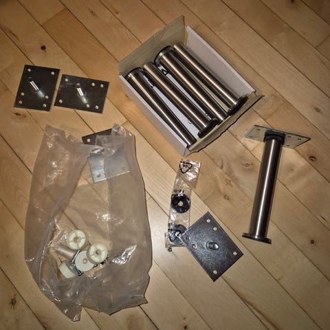 IKEA GODMORGON bordben i rustfri stål. Sættet består af fire cylindriske ben med firkantede monteringsplader med forborede huller til skruer. Benene er højdejusterbare via sort plastskrue i toppen, hvilket gør dem egnede til montering under bordplader, skabe eller andre møbler, hvor der er behov for regulerbar højde og stabil understøtning.