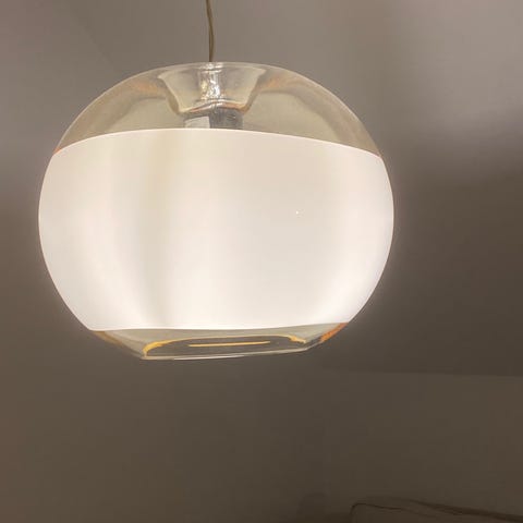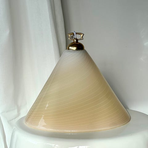 Smuk La Murrina Murano loftlampe/pendel, 1970. Klart og mælkehvidt glas i smukke kontraster. En bølget kant danner en ramme om lyset. Leveres med hvidt ophæng og baldakin, og lampen er monteret med en ny snoet stofledning. I meget flot vintage stand.