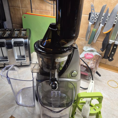 Enheden består af motorbase, påfyldningstragt, juicebeholder, skrue, filter og rensebørste. Slowjuiceren arbejder ved lav hastighed, hvilket giver en grundig udpresning af råvarerne. Egnet til fremstilling af juice, grøntsagsjuice og andre kolde drikke. Aftagelige dele kan tages af for rengøring efter brug.