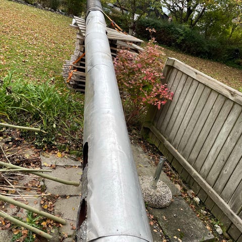 Fin muret skorsten er blevet tilovers efter skift til jordvarme. Kan løftes ned med kran og flyttes med lastbil. Højde over flise 430cm. Lysning 20cm. Måler 80*80cm