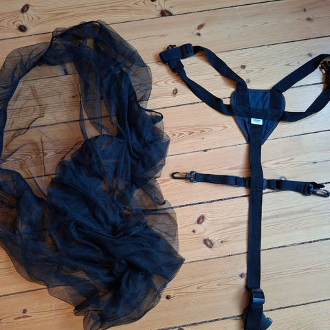 Sele til barnevogn fra Thorn. Råhvid. Hvidt myggenet til barnevogn eller seng. Sælges samlet for 100 kr.