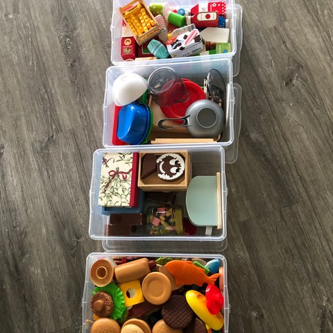 Masser af legemad og udstyr. Frugt og grøntsager, kager, brød, pizza, burger mm. Det meste i træ, noget i plast. Godt brugt, men der er tusindvis af timers leg i det.