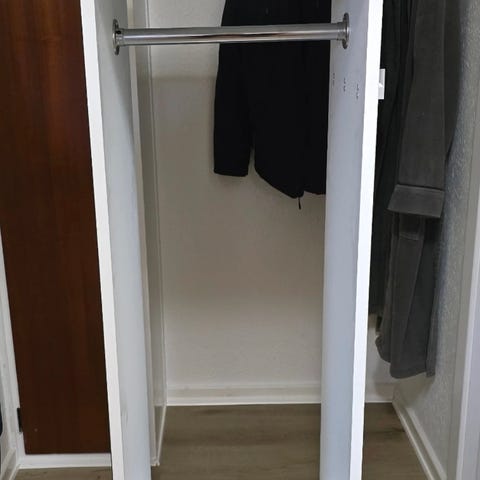 Fritstående skab med hylder eller bøjlestang. Alt medfølger.