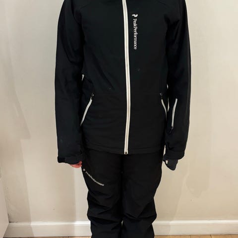 Peak Performance ski-/vintertøj sæt bestående af jakke og bukser i orange og sort. Str 150 cm