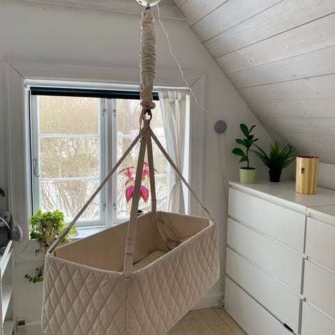 Moonboon vugge til spædbørn. Vuggen hænger i stropper fra et stativ og har en rektangulær liggeflade. Indersiden fremstår polstret for ekstra komfort. Egnet til brug indendørs som sove- og hvileplads til baby. Vuggen leveres med ophæng og stativ som vist på billederne. Vejl. Pris. 6200.- brugt i 3 måneder.