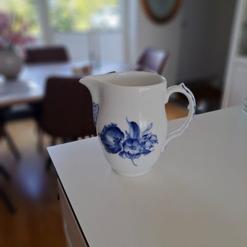Royal Copenhagen porcelænskande i hvid porcelæn med blå blomstermotiv på siden. Kanden har låg med knop dekoreret i blå og en markant, buet hank. Klassisk form med let facetteret korpus og rund fod. Velegnet som kaffekande, tekande eller til servering af varme drikke. Stemplet i bunden med Royal Copenhagen mærke og malernumre.