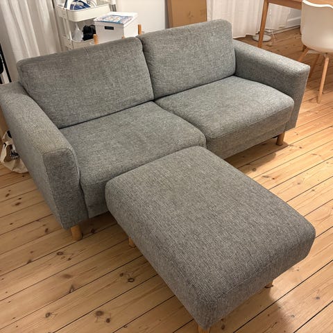 Slidstærkt materiale og ikke sart. Har enkelte brud i stoffet på de bagerste hjørner og på rygpuderne - særligt den ene af pude (se fotos).