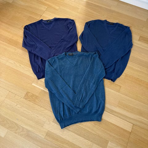 2 stk. SAND Copenhagen herresweater i størrelse L (sort) og 1 i stk. M (grå). Sweateren er i merinould med V-hals og lange ærmer. Materialet er merinould, som er kendt for at være blødt og temperaturregulerende. Velegnet som hverdagstrøje eller som lag over en skjorte eller T-shirt.