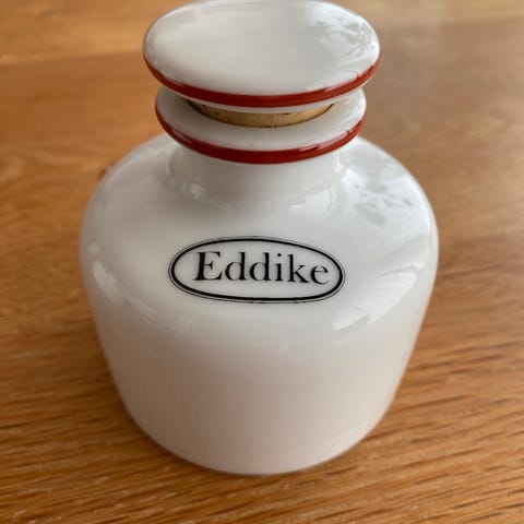 Højde 12,5 cm, diameter 10,5 cm , jeg har også Eddike karaffel til salg for 150 kr.