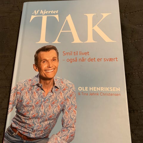 Ole Henriksen Tak bog. Hårdt omslag. Dansk tekst. Bogen har undertitlen "Smil til livet – også når det er svært" og er skrevet i samarbejde med Tina Jøhnk Christensen.