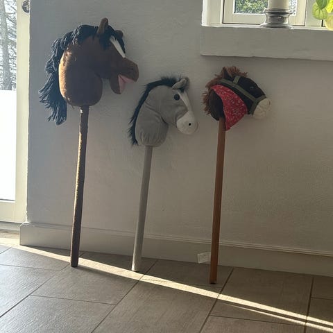 3 kæpheste med masser af tilbehør. Hvid og brun er fra Panduro, hvor man selv ‘bygger’ hesten med manke af garn og limede øjne på. Den plettede er fra Astrup. Tilbehør: hjemmebyggede holdere i træ til 4 kæpheste, diverse rosetter, grimer, hovedtøj, dækkener, træktov og foder (gulerødderne er hjemmehæklede). Fra ikke-ryger hjem. Brugt af et barn.