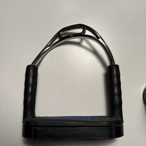 Stigbøjler (14 cm), stigremme (135 cm) og QHP opbevaringspose. Sættet består af et par sikkerhedsbøjler med gummiflex og lyse skridsikre trædeflader (slidte men brugbare), et sæt læderstigremme fra Mikado (ikke brugt meget) samt en ternet stofpose fra QHP til at sætte på efter ridning så sadlen ikke bliver slidt/skidt og/eller til opbevaring.