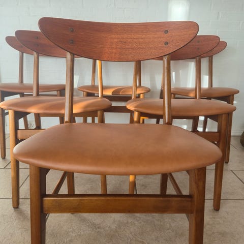 8 stk Harry Østergaard stole, de kan købes i det antal man skal bruge - produceret i 1960'erne - fantastisk design med tap samlinger og det ikoniske krydsstel - renoverede stel, der fremstår med meget få brugsspor, nybehandlede, 100 procent stabile med moderne siddehøjde på 46 cm - nypolstrede i italiensk cognac læder og koldskum fra danske cladius for optimal komfort