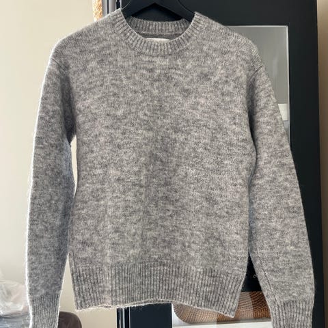 Samsøe Samsøe Eti crew neck uldtrøje til kvinder i størrelse XS. Trøjen er i grå meleret farve og strikket i uldmateriale. Klassisk rund hals og ribkanter ved hals, ærmer og bund.