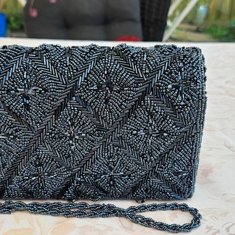 Fin og helt ny lille taske i stofligt krokodille look. Med strop. Sort og stål. 10 x 20 cm.