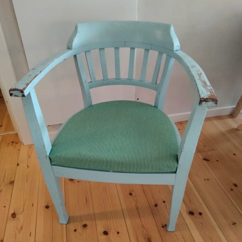 Stolen er blevet limet et par gange i sit liv. Men har stærke samlinger og virker som den skal.