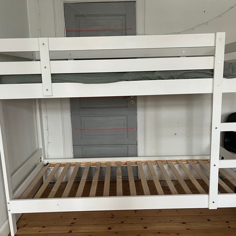 IKEA Mydal køjeseng i hvidmalet træ. Sengen består af to liggepladser over hinanden med lamelbund på både øverste og nederste plan. Der er integreret stige i gavlen samt sengehest på øverste køje for øget sikkerhed. Velegnet til børneværelse, hvor der ønskes to sovepladser på begrænset plads. På en af siderne ses synlige brugsspor i malingen med afskalninger.