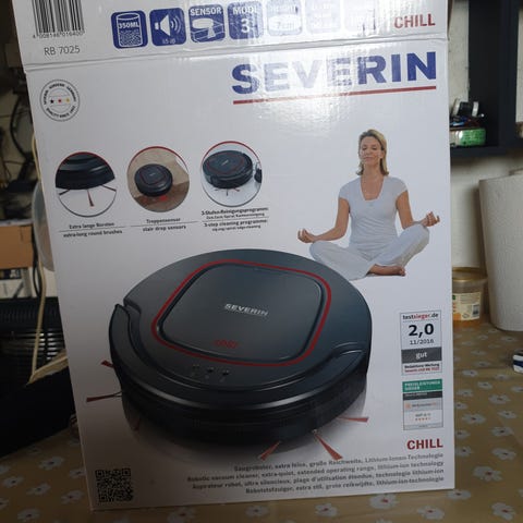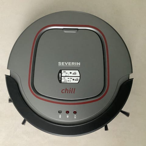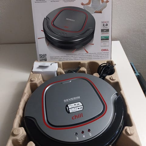 Severin Chill robotstøvsuger i grå med sort kant. Rund model med betjeningsknapper på fronten og aftagelig støvbeholder under topdækslet. Velegnet til automatisk støvsugning af hårde gulve og eventuelt lave tæpper i hjemmet. Leveres med oplader som vist på billederne.