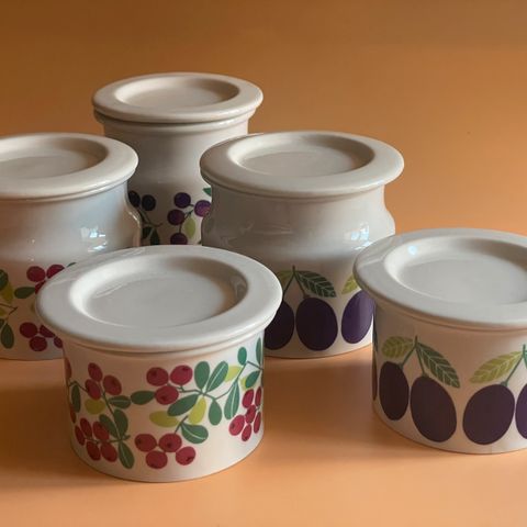 Fine marmeladekrukker. Den ene er formet som brombær og den anden er en bi marmeladekrukke. De er begge i god stand.