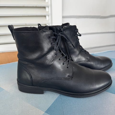 Ecco støvler i størrelse 38 i sort læder. Støvlerne har kraftig, mønstret gummisål og lynlås i siden. Indvendigt er der blødt fór, som giver ekstra komfort. Velegnet som hverdagssko i køligere vejr. Leveres med original æske, hvis ønsket.