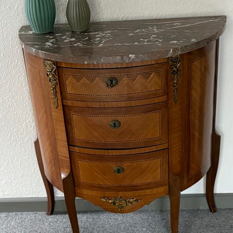Fremstår i flot antik stand med naturlig patina, der vidner om møblets alder. Marmorpladen er intakt . Skufferne kører ok.