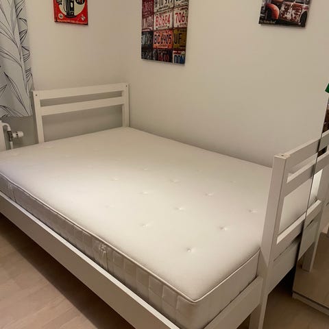 IKEA HYLLESTAD springmadras i hvid. Madrassen er 140 x 200 cm og 27 cm tyk. Madrassen har indbyggede pocketfjedre og polstring, som fordeler vægten jævnt. Velegnet til brug i sengestel som vist på billederne eller andre standard senge med tilsvarende mål. Neutralt, hvidt design der passer ind i de fleste soveværelser eller gæsteværelser.