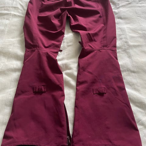 Burton Dryride skibukser i størrelse small. Bukserne er orange og har gråt foer. De er designet som skibukser/snowboardbukser med forstærket materiale ved benafslutningerne. De er lidt beskidte nederst på benet, men har ingen huller. Tjek billederne.