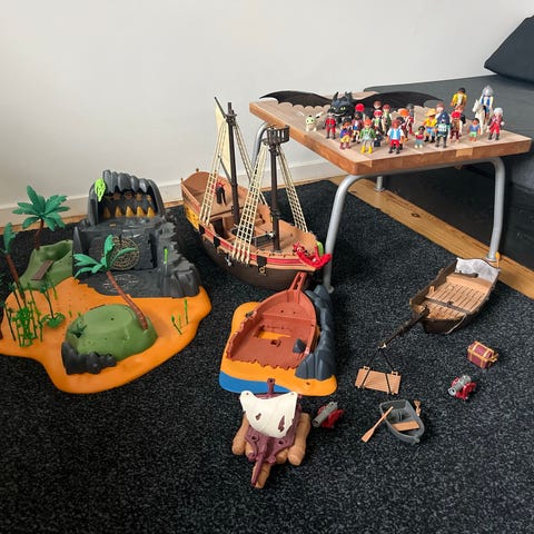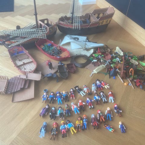 Playmobil blandet figursæt med flere piratfigurer, andre figurer, køretøj og diverse små dele og tilbehør. Sættet indeholder blandt andet våben, skibe/dele af skibe, hjelme, hatte og andre løse dele, som kan bruges til leg og udbygning af eksisterende Playmobil-samlinger.