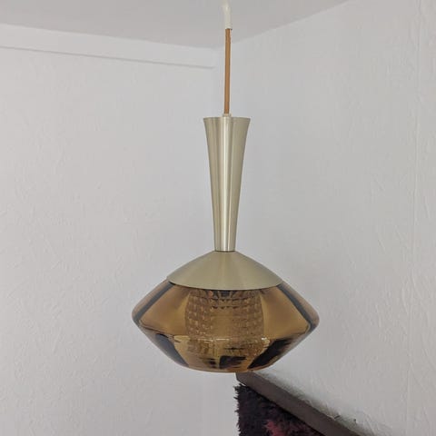 Retro lampe / retro pendel I røgfarvet glas, designet af Carl fagerlund for svenske orrefors . Lampen fremstår I ok stand. Prisen er 400kr. Varen kan sendes på købers regning. Se også mine andre opslag for flere lamper.