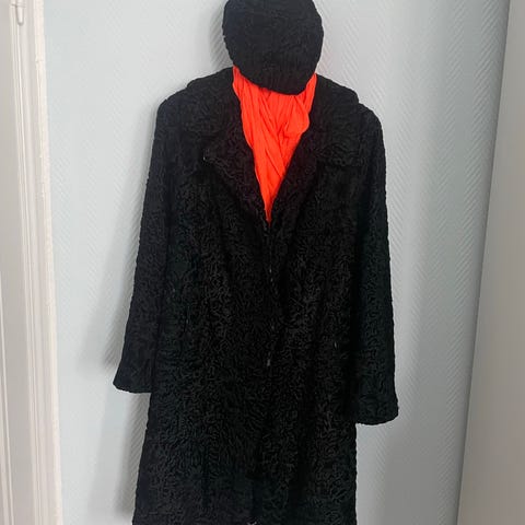 Zara frakke i pels til kvinder i størrelse L. Frakken er sort og har en blød, pelset overflade med struktur. Modellen har krave og lukkes foran med knap. Længden går cirka til midt på låret afhængigt af højde. Velegnet som yderjakke i køligere vejr. Materialet fremstår som pels, baseret på mærkning og udseende på billederne.