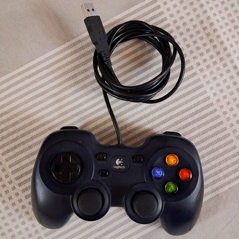 Logitech F710 gamepad. Trådløs controller i sølv med sorte greb. Udstyret med to analoge styrepinde, retningsknap (D‑pad), fire farvede frontknapper, start/back-knapper samt skulder- og triggerknapper. Egnet til brug med kompatible pc‑systemer og andre enheder, der understøtter denne model af trådløs gamepad.