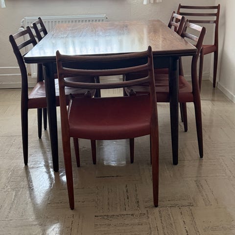6 palisander stole med spisebord sælges