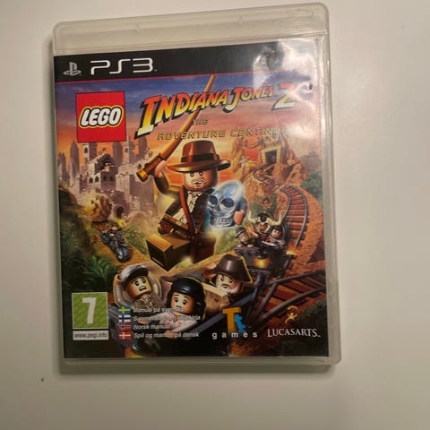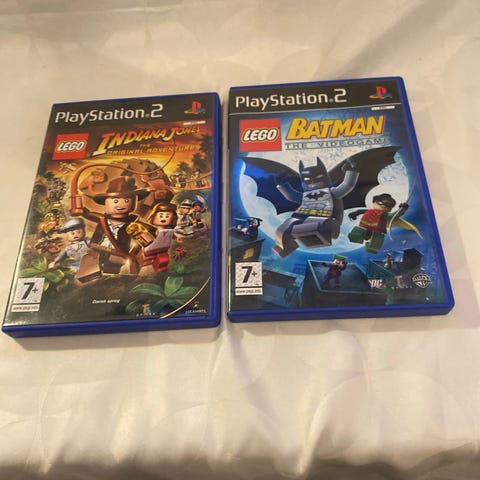 Lego Indiana Jones The Original Adventures og Lego Batman The Videogame PlayStation 2 spil. Begge spil leveres i original PS2-plastboks med forside- og bagsidecover samt tilhørende spildiske. Lego Indiana Jones The Original Adventures følger Indiana Jones-universet i Lego-stil med eventyr og platformelementer. Lego Batman The Videogame er et action- og platformspil i Lego-version af Batman-universet. Begge titler er mærket med aldersanbefaling 7+ på omslaget og er udgivet på DVD-format til PlayStation 2-konsollen.