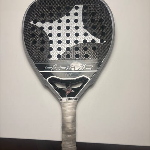 StarVie Tritón padelbat i sort og hvid. Battet har perforeret slagflade med stjernedesign og håndledsrem monteret på grebet. Håndtaget er omviklet med hvidt grip. På rammen fremgår bl.a. betegnelserne Full Plane Effect og Carbon 3K samt information om, at battet er håndlavet i Spanien. Velegnet til padelspillere, der ønsker et bat med struktureret overflade og carbonkonstruktion.