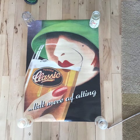 Tuborg reklameplakat med tegneserie motiv. Nederste del af plakaten har tydelige slidskader og afskalning af overfladen. Velegnet som vægdekoration eller samlerobjekt.