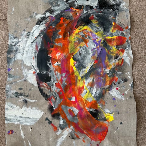 Abstrakt maleri på lærred i røde, hvide og gule nuancer. Motivet består af brede, dynamiske penselstrøg og lag af maling, der giver et udtryksfuldt og farverigt helhedsindtryk. Velegnet som vægdekoration i stue, kontor eller andre opholdsrum. Størrelse og kunstner er ikke oplyst.