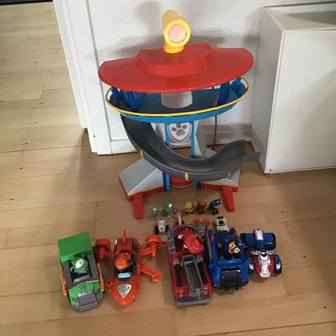 Paw Patrol legesæt med lille tårn, paw patroller og lille chase-bil. Fungerer fint.