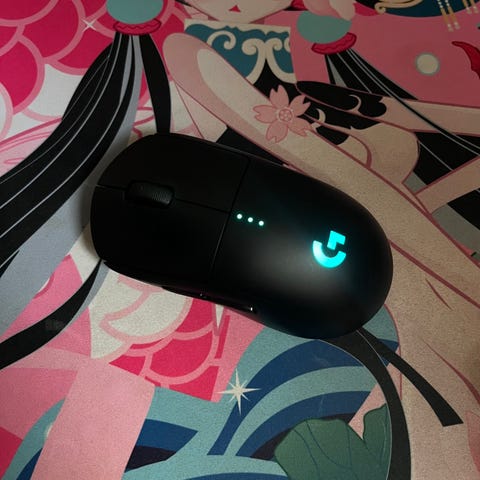 Logitech G Pro trådløs gaming mus i sort. Musen er designet til gaming med optisk sensor i bunden og flere knapper på toppen. Den har glideskøjter under bunden for jævn bevægelse på musemåtten og et kompakt, symmetrisk design, der kan bruges af både højre- og venstrehåndede afhængigt af knapopsætning. Velegnet til brug med computer til spil og generelt arbejde.