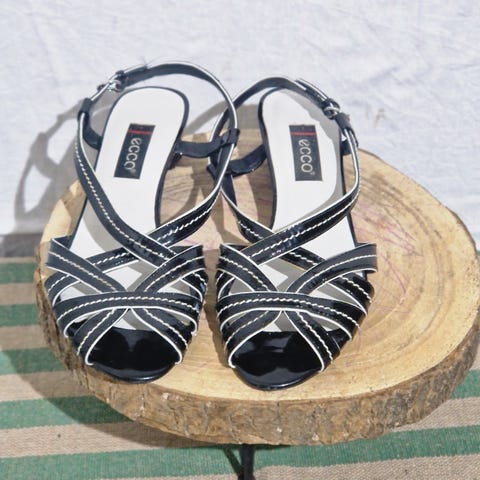 Ecco sandaler i str. 39. Åbne sandaler i sort med flere remme over foden og blokhæl. Hælhøjde ca. 5 cm (jf. mål på billede). Overdel og sål i matchende sort materiale med åben tå og åben hæl. Velegnet som hverdagssandal eller til pænere brug i varme måneder.