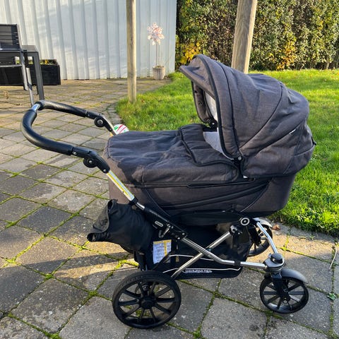 Flot og velholdt Grå kombivogn. Den har praktiske drejehjul foran, som kan låses så de kun kører ligeud (fx til en tur i skoven med småsten), alle dæk er punkterfrie og den har også en varekurv. Den har også rygstøtte i bunden, så barnet kan sidde op. Stellet har ingen rust og bremsen virker som den skal. Det er let at slå sammen og alle fire hjul klikkes også let af. Styret kan justeres i højden og bremsen trykkes også let ned. Den har termobund til sommer og vinter og der er ligeledes udluftning i kalechen.