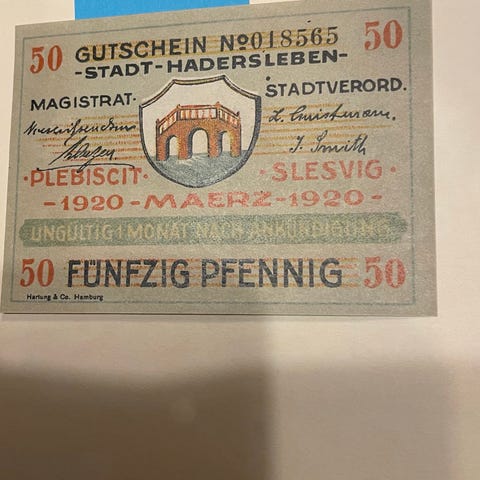 Nødpengesedler, daler april 1920, samling med to ældre sedler i sort/hvid tryk. Øverste seddel har motiv af mølle og marker med pålydende værdi 25, nederste seddel har motiv med mennesker og flag med pålydende værdi 50. Egnet til samlere af ældre pengesedler og historisk materiale.
