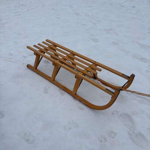 Lang kælk med træsæde.