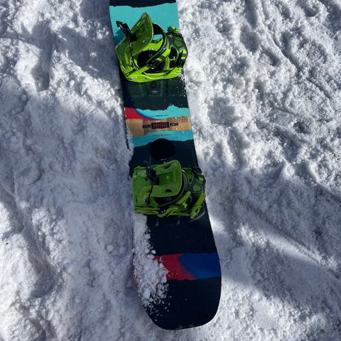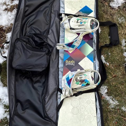 Ride snowboard med bindinger og transporttaske. Snowboardet har grafisk blå/hvid top og er udstyret med justerbare bindinger. Medfølgende taske er polstret og har lynlås til opbevaring og transport af boardet.