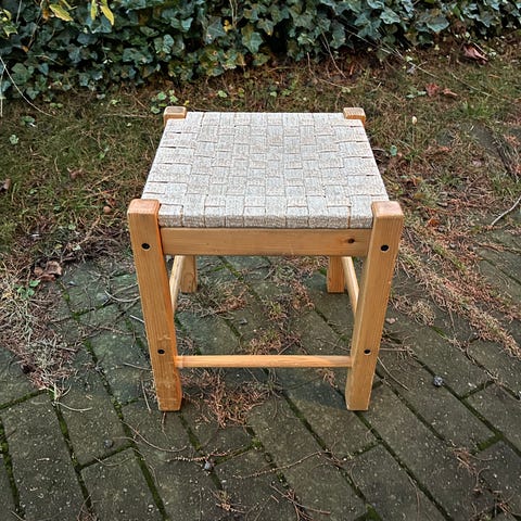 Skammel med fletsæde i naturfarvet materiale og stel i lyst træ. Egnet som ekstra siddeplads, fodskammel eller lille afsætningsplads i eksempelvis stue, entre eller soveværelse. Enkel, funktionel udformning med firkantet sæde og rundede ben.