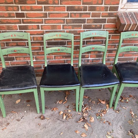 Spisestuestole polstret stof grøn mønstret betræk og træstel.