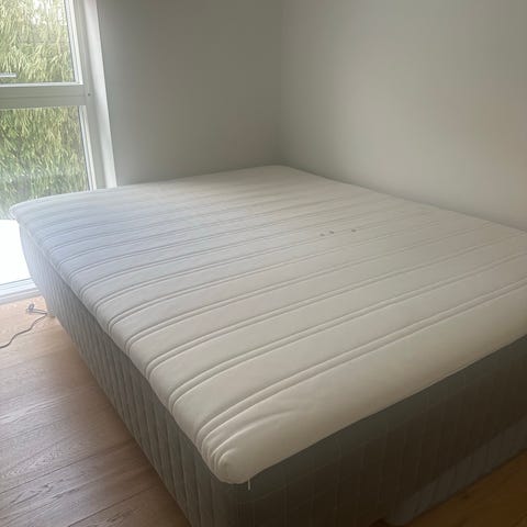 160x200 boxmadras på ben med topmadras og sengegavl. Røgfrit og dyrefrit hjem.