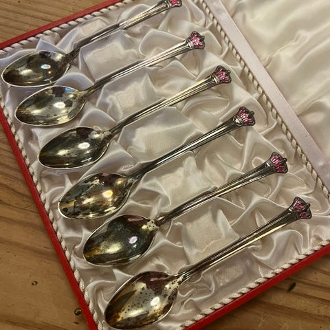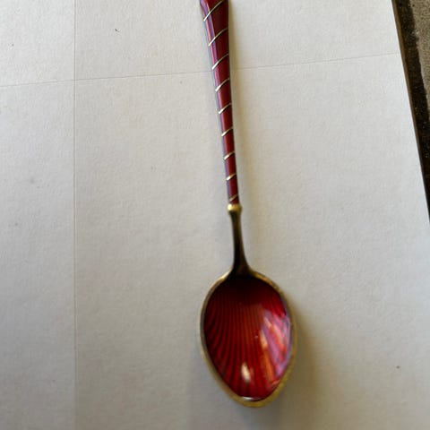 6 smukke Moccaskeer i Sterling sølv forgyldte og med guilloche emalje fra Københavns ske -fabrik.